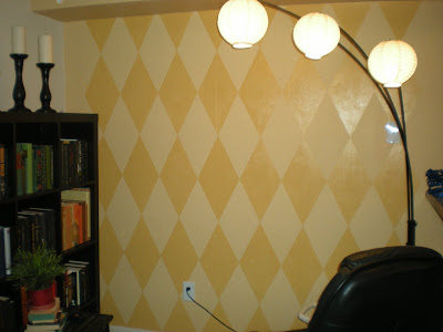 so i got a wild hair this weekend...decided that i just had to have harlequin diamonds on one of my walls (as in, the kind of cool, contrasting design usually seen on Jester outfits). anyway, i've been wanting to do it for a while, so...as if rearranging wasn't enough...LOOK AT THIS! LOOK HOW RAD! i've decided that every house/apartment/shack i ever live in will have at least one wall painted like this.